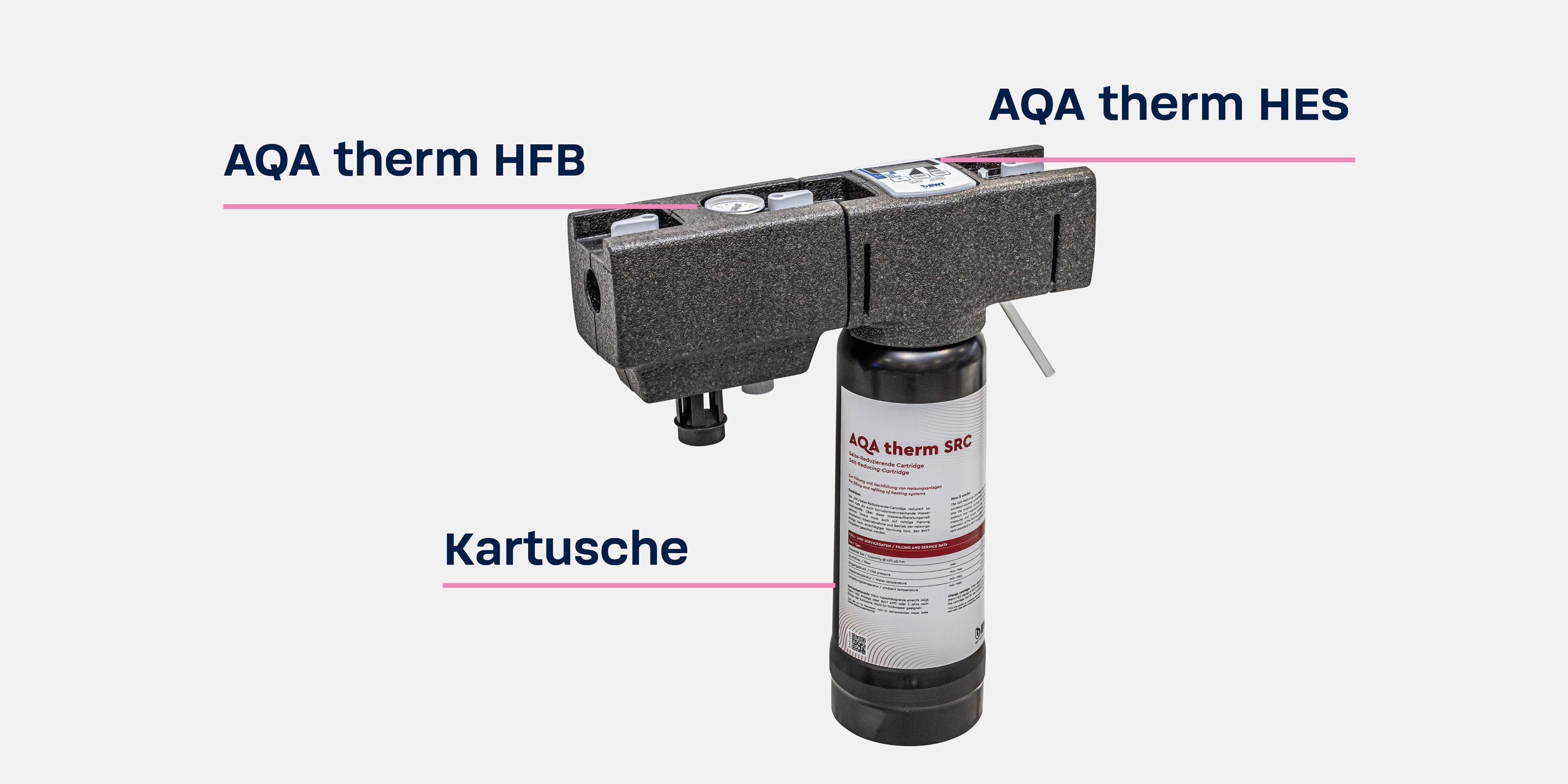 Die AQA therm HWG besteht aus drei Teilen. Der Heizungs-Füll-Block (HFB) sorgt mit seinem Systemtrenner dafür, dass kein Heizungswasser ins Trinkwassersystem gelangt. Bei der Heizungsstation (HES) wird das Wasser normgerecht enthärtet oder entsalzt. In der HES wird dabei eine entsprechend der Anlage passende Kartusche verwendet. Sie wird nach Erschöpfung, spätestens aber nach 2 Jahren gewechselt.